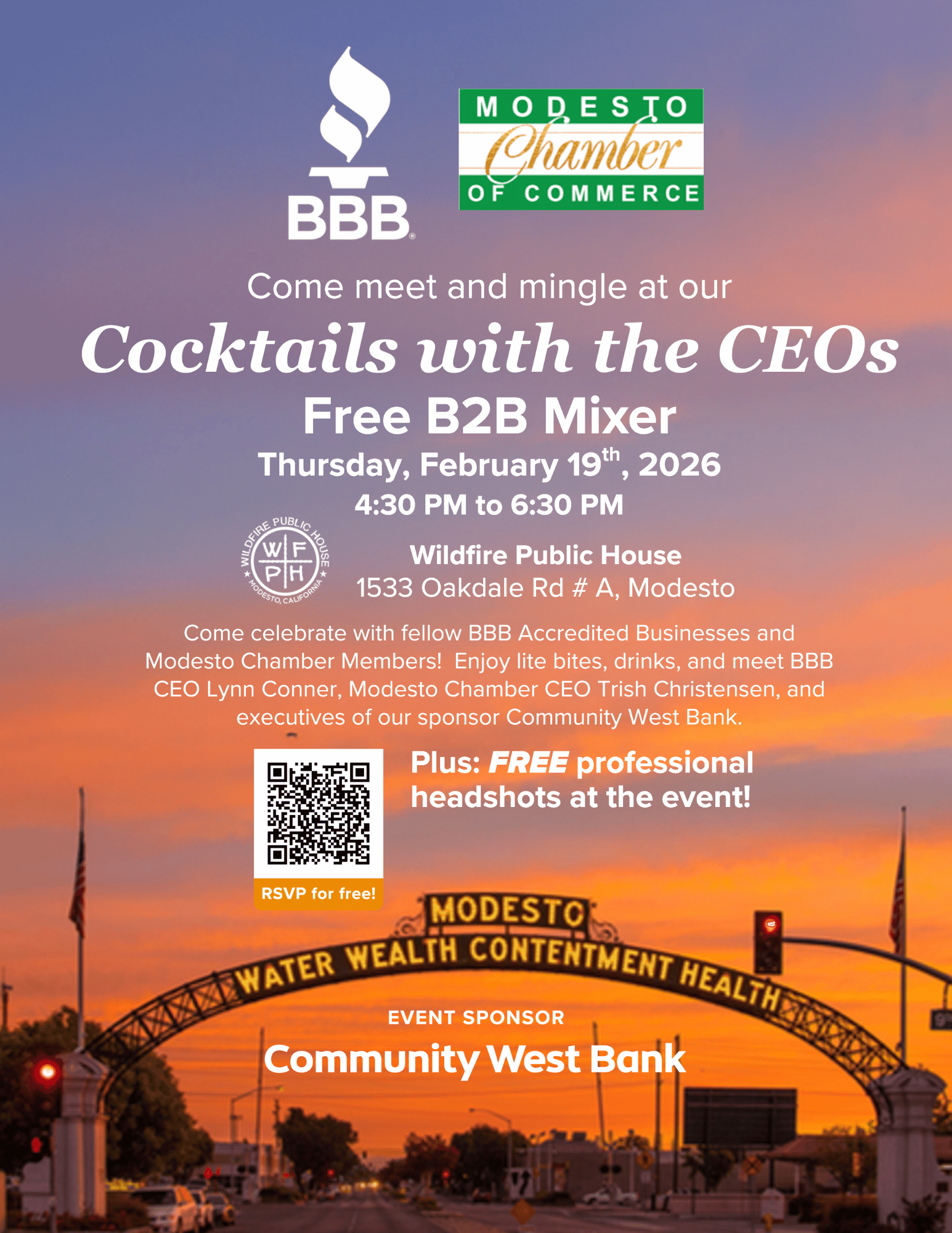 « All Events Cocktails with the CEOs – A BBB & Modesto Chamber of Commerce B2B Mixer February 19 @ 4:30 pm - 6:30 pm « Leadership Modesto Steering Committee Meeting Government Relations Council Meeting » Add to calendar Google Calendar iCalendar Outlook 365 Outlook Live Details Date: February 19 Time: 4:30 pm - 6:30 pm