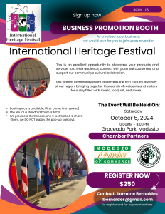 « All Events This event has passed. International Heritage Festival October 5, 2024 @ 10:00 am - 4:00 pm « Grand Opening – Xfinity Modesto Chamber of Commerce Board Meeting » Add to calendar Google Calendar iCalendar Outlook 365 Outlook Live Details Date: October 5, 2024 Time: 10:00 am - 4:00 pm Event Category: Community Event Related Events Members Choice Awards Banquet & Board Installation January 29, 2026 @ 5:30 pm - 8:30 pm