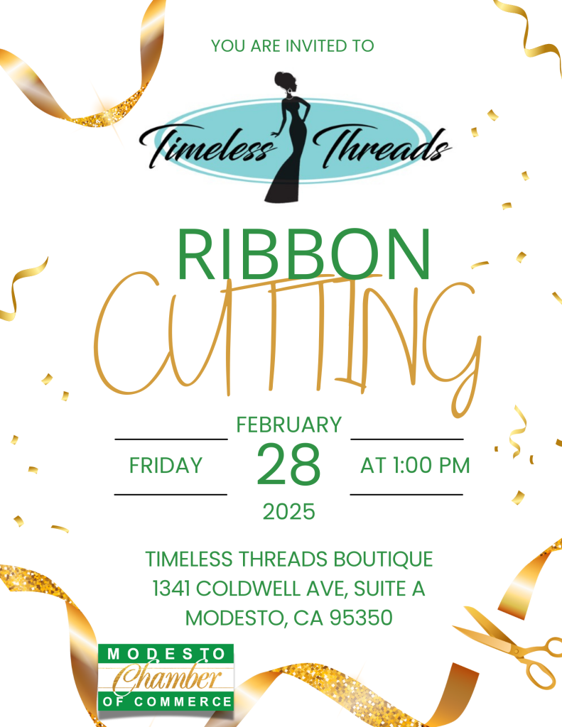 « All Events This event has passed. Timeless Threads Boutique Ribbon Cutting February 28 @ 1:00 pm - 1:30 pm « Rose’s Sparkling Cleaning Services Ribbon Cutting Modesto Chamber of Commerce Executive Committee Meeting » Add to calendar Google Calendar iCalendar Outlook 365 Outlook Live Details Date: February 28 Time: 1:00 pm - 1:30 pm Event Category: Relationship Event Venue Timeless Threads Boutique 1341 Coldwell Avenue, Suite A Modesto, CA 95350 United States + Google Map Related Events Holiday Multi-Chamber Mixer December 18 @ 5:30 pm - 7:30 pm Members Choice Awards Banquet & Board Installation January 29, 2026 @ 5:30 pm - 8:30 pm
