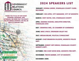 All Government Relations Council meetings are held at the Modesto Chamber of Commerce in the conference room at 12:00 p.m. Meetings are open to all chamber members Click here to visit our Events Calendar for more info.